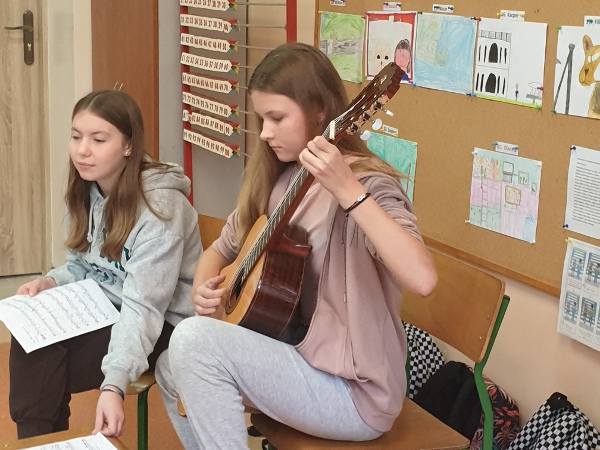 W związku ze zbliżającym się Narodowym Świętem Niepodległości uczennice klasy VI b przygotowały nam wspólne patriotyczne śpiewanie. Oczywiście z gitarowym podkładem w wykonaniu Karoliny.