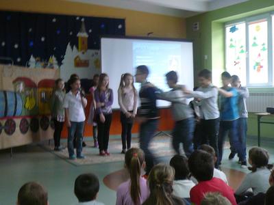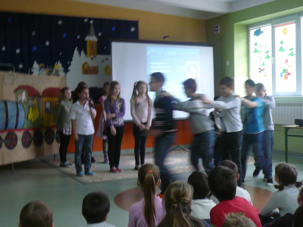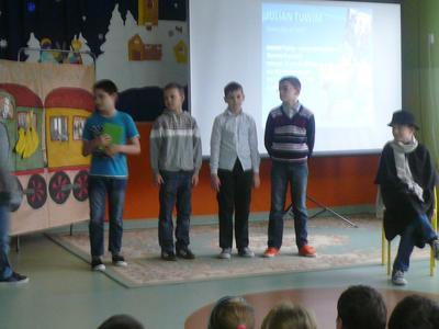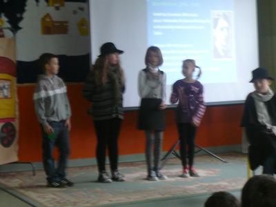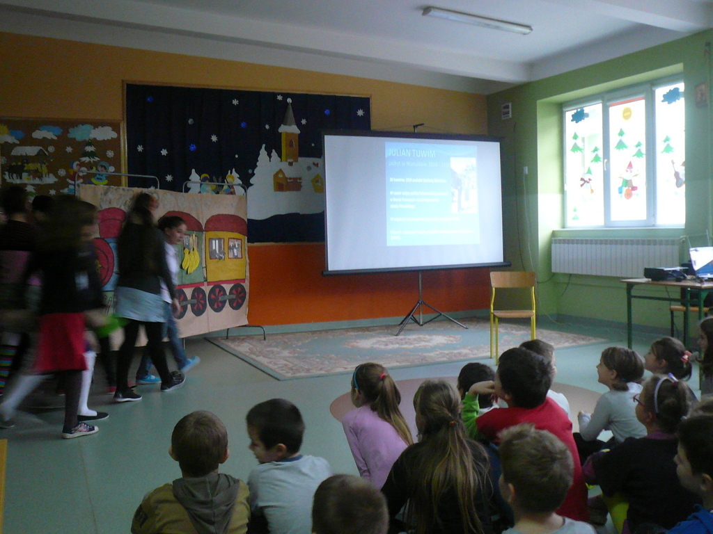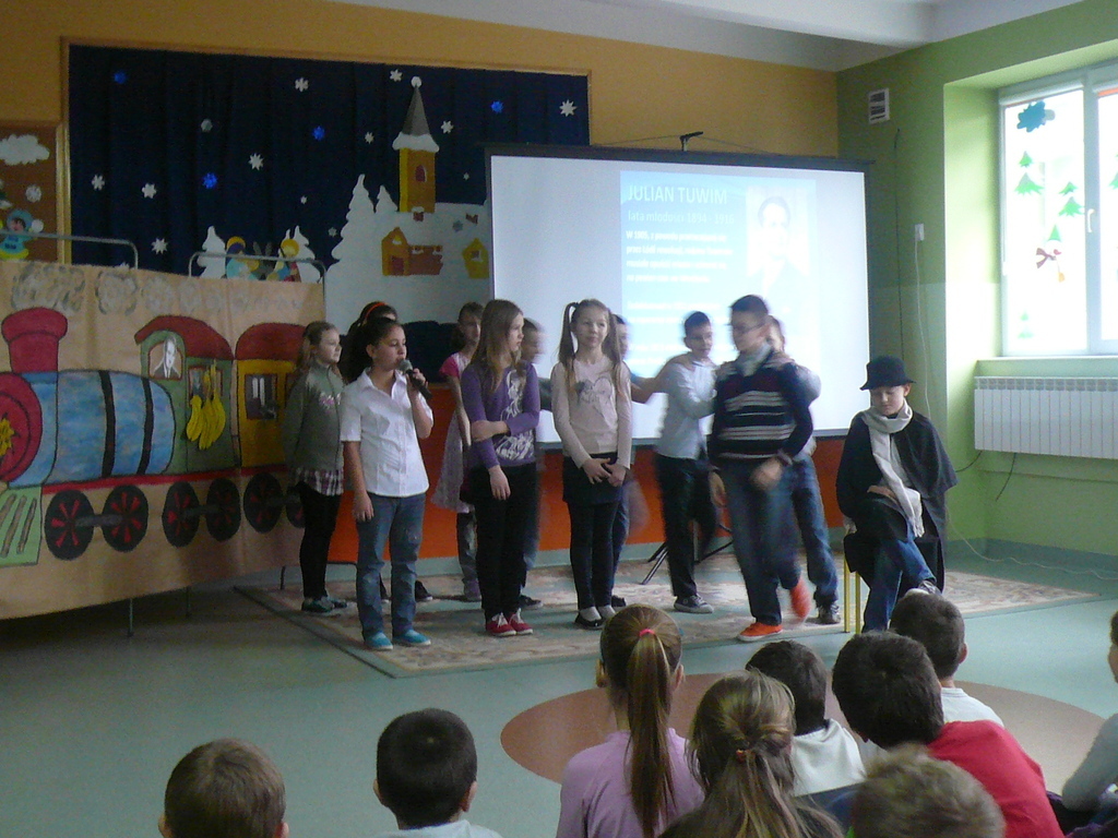 18 grudnia był dniem poświęconym twórczości znakomitego poety Juliana Tuwima. Z tej okazji uczniowie Naszej szkoły wraz z opiekunami p. Joanną Kurpiewską i p. Katarzyną Roman przygotowali wspaniałe przedstawienie podczas którego wykonano recytacje wierszów artysty. "Szkolni aktorzy" dokonali także inscenizacji najpopularniejszych wierszy takich jak znana wszystkim "Lokomotywa". Przedstawienie zostało skierowane do maluchów z klas I-III którym występ starszych kolegów i koleżanek bardzo się podobał za co zostali nagrodzeni burzą oklasków. Na uznanie zasługuje także przygotowanie przez p. Bożenę Kalinowską ciekawej prezentacji multimedialnej przedstawiającej życie poety, a także szaty graficznej i scenografii przygotowanej przez p. Beatę Pierzchałę i p. Renatę Szatkowską specjalnie na potrzeby przedstawienia. Julian Tuwim był autorem popularnych wierszy dla dzieci, takich jak . Lokomotywa, Ptasie radio, Pan Hilary, Słoń Trąbalski, Bambo, Bibliofil. Nieszablonowa i dowcipna gra słów zawarta w tych wierszach sprawiła iż zyskały wielką popularność wśród czytelników, a wybrane fragmenty są często cytowane w trakcie różnych zabawnych wydarzeń, bądź sytuacji. Wykonane przedstawienie teatralne miało na celu zaznajomić Naszych najmłodszych uczniów z twórczośą tego wybitnego autora, a także dokonać interpretacji jego najpopularniejszych dzieł w inny śmieszny i nieszablonowy sposób. |