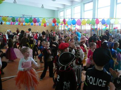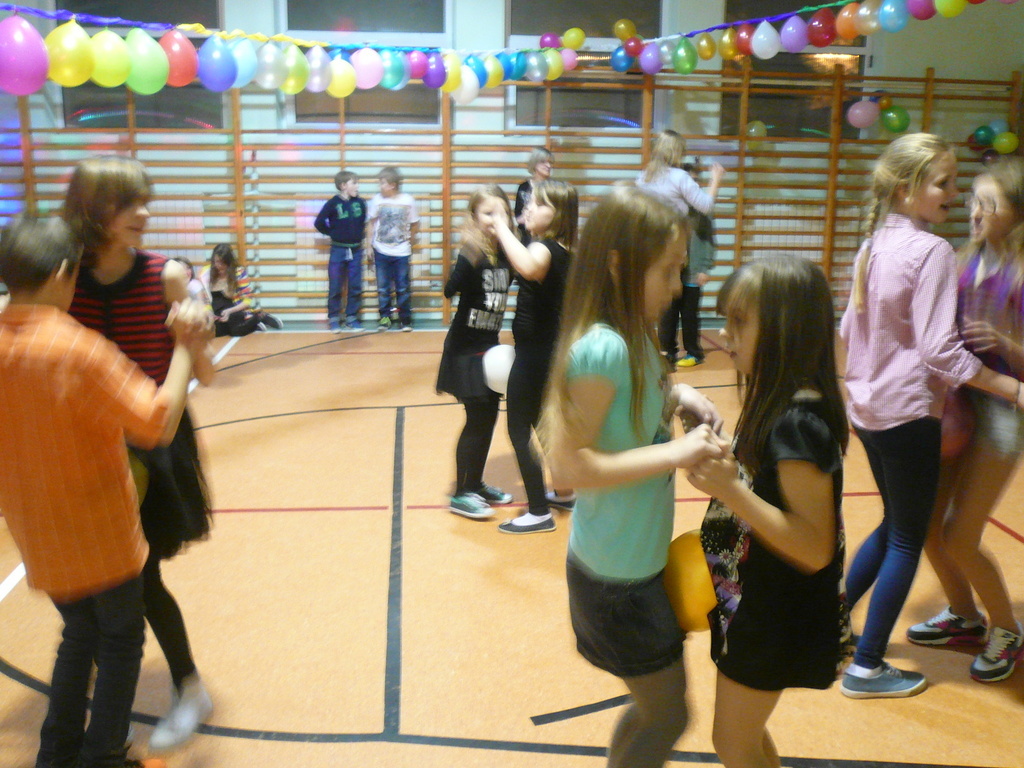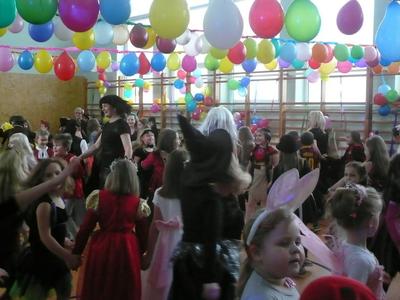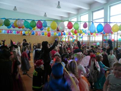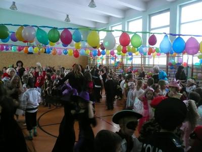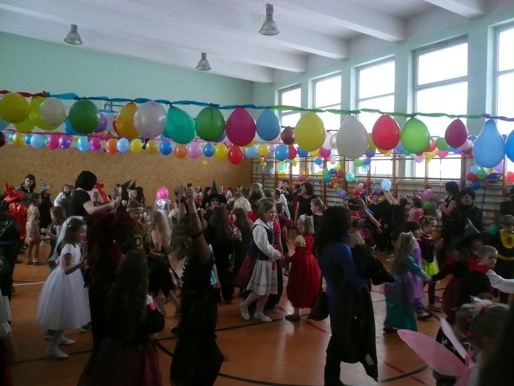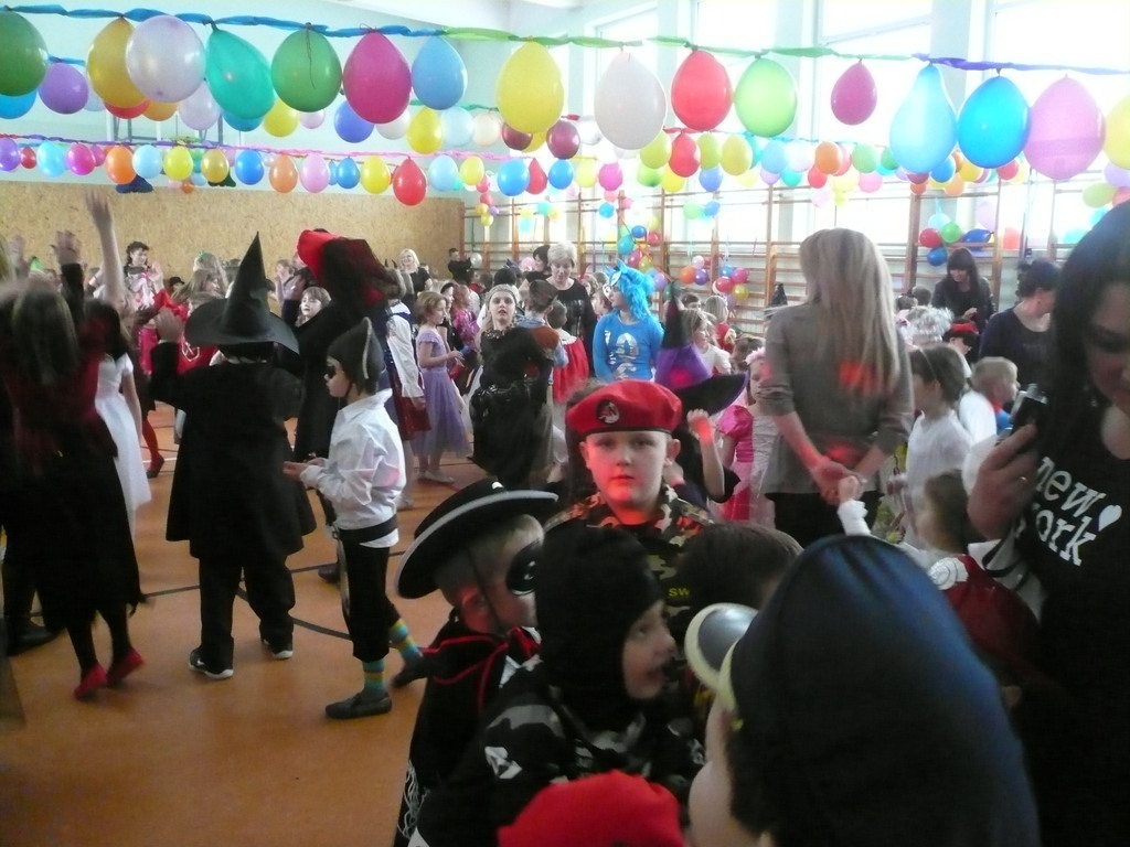 Jak sie bawić to na całego. Z takim hasłem najmłodsi nasi podopieczni rozpoczęli zabawę karnawałową. Maluchy z klas 0-III stanęły na wysokości zadania i pojawiły sie na parkiecie w przeróżnych, wymyślnych przebraniach :-) Mogliśmy podziwiać największe zgrupowanie księżniczek na metr kwadratowy bawiących się ze swoimi opiekunami w rytmach najpopularniejszych tanecznych utworów. Chłopcy również nie pozostali w tyle i na parkiecie królowali komandosi, ludzie- pajaki, mali rycerze, karatecy i wszelkiej maści obrońcy wszechświata z supermenem na czele :-) Zabawa była świetna, a zdając sobie sprawę że dla niektórych maluchów był to pierwszy taki szkolny bal, tym bardziej należą sie wielkie słowa uznania za wspaniałą postawę. Bawią się mali...bawią i więksi. Po południ swoje popisy na parkiecie rozpoczęli uczniowie z klas 4-6. Chłopcy i dziewczynki przystąpili do zabawy w rytmie najpopularniejszych obecnie hitów. Były tańce na gazecie i z balonami, konkursy które wywoływały śmieszne sytuacje i budowały pozytywny klimat imprezy. Nad przebiegiem zabawy czuwał wodzirej który zagrzewał to wspólnej zabawy, przeprowadzał konkursy i czuwal nad ich przebiegiem. Duże podziekowania należą sie rodzicom i wychowawcom uczniów za przygotowanie poczęstunku dla dzieci i opiekę podczas balu. Ich praca zaowocowała bezbłędnym przebiegiem imprezy. Wszystkim którzy dołączyli się do pomocy przy dekorowaniu sali należą się słowa uznania za włożony trud. Dzięki i oby tak dalej.